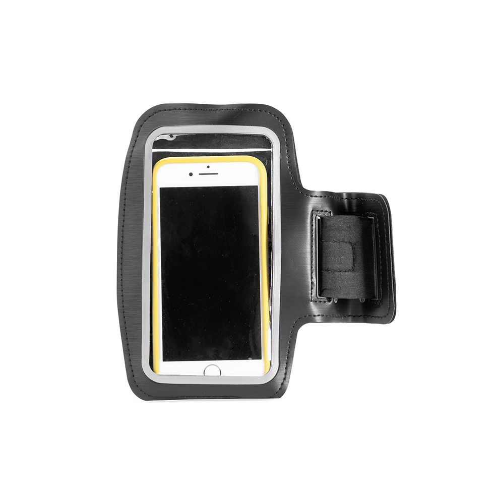 Braçadeira para celular em couro sintético e revestimento posterior em neoprene. Possui capacidade para aparelhos de até 6,5 polegadas, além de visor em plástico e alça de neoprene com fechamento em velcro para ajuste no braço.