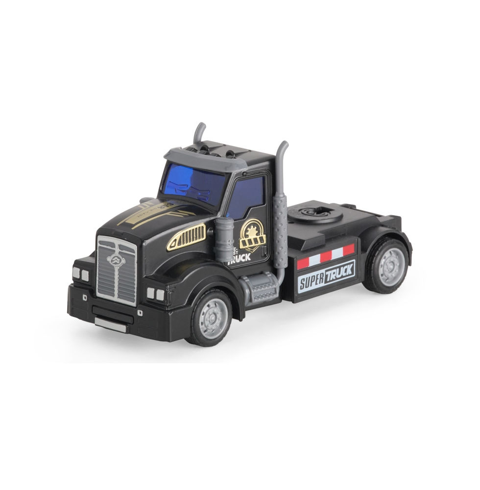 Caminhão em miniatura com estrutura feita em metal e plástico. Apresenta mecanismo de fricção nas rodas traseiras e acabamento detalhado.
