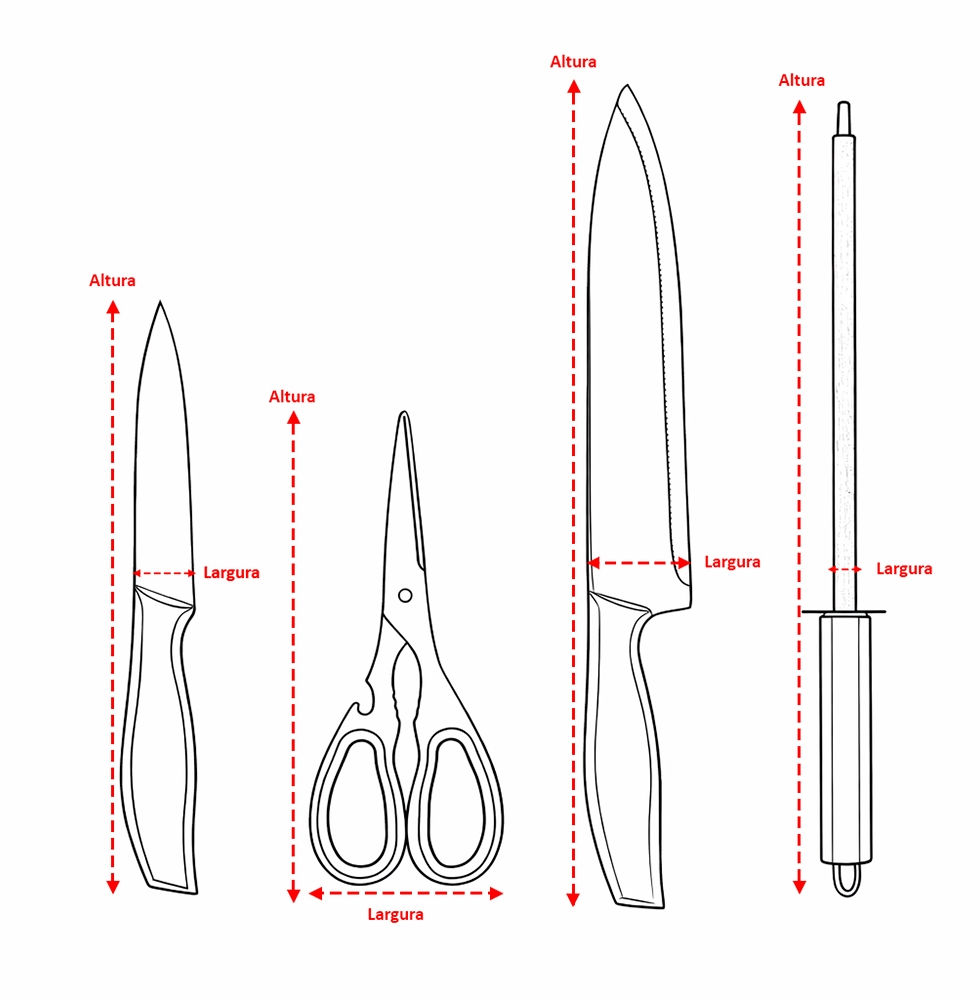 Kit churrasco formado por quatro itens em inox: uma faca de 8 polegadas, uma faca de 5 polegadas, uma chaira e uma tesoura com detalhes emborrachados no cabo. Acompanha embalagem em papelão.
