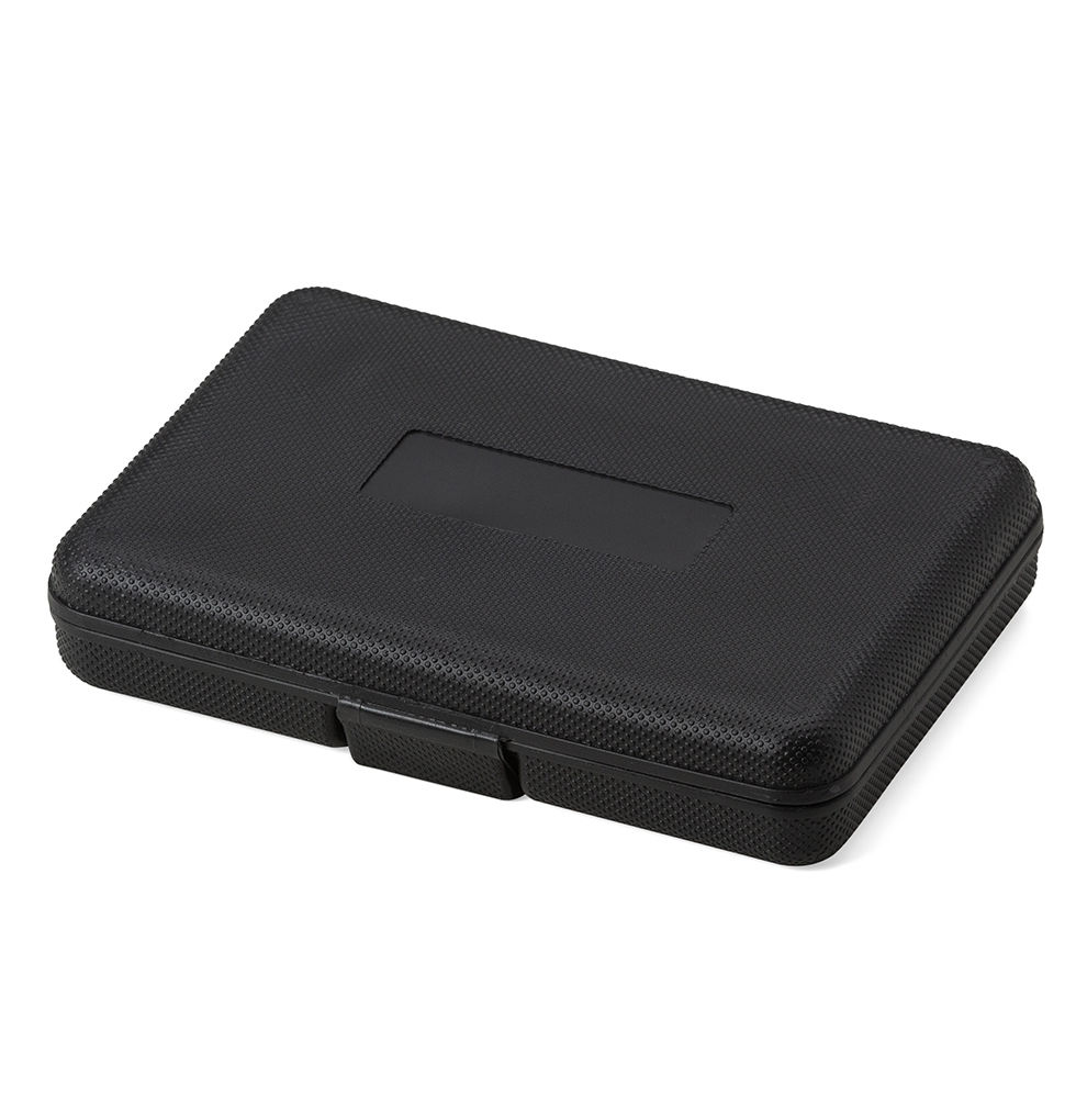 Kit ferramenta 11 peças em estojo plástico. Maleta plástica com detalhe retangular no centro frontal e verso com o detalhe na lateral inferior, possui texturização no estojo e uma trava superior. Acompanha: conjunto de 5 chaves Allen, trena de 1 metro, chave teste, estilete, chave Philips, chave de fenda e alicate.